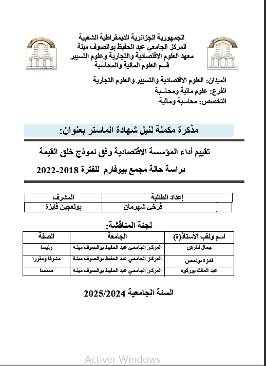 بولعجين فايزة (مشرفا) & فرخي،شهرمان (2025). تقييم أداء المؤسسة الاقتصادية وفق نموذج خلق القيمة-دراسة حالة مجمع بيوفارم للفترة2018-2022 (ماستر- ل م د) . المركز الجامعي عبد الحفيظ بوالصوف ميلة.