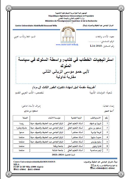This study, entitled: (Discourse Strategies in the Book: Wasitat al-Suluk fi Siyasat al-Muluk by Abu Hammu Musa Al-Zayani II), aims to uncover the discourse strategies present in this text, exploring the mechanisms involved and approaching it with a modern perspective that bridges an old Algerian literary text and delves into it through pragmatics. Pragmatics, as a branch of linguistics, studies various determinants related to language use in context. To achieve this goal, the study plan was structured into five chapters, a conclusion, and two appendices. The first chapter is theoretical and defines the key concepts related to pragmatics, discourse, strategies, and their mechanisms. The remaining four chapters are arranged as follows: (1- The Solidarity Strategy, 2- The Directive Strategy, 3- The Allusive Strategy, 4- The Persuasive Strategy). These chapters have a practical focus, beginning with a definition of each strategy, an explanation of its use, controlling factors, and the linguistic means and tools employed by the author, all supported by examples and evidence from the text. The study concludes by presenting the main findings derived from research, reading, and analysis. It also includes two appendices: the first contains a biography of the author Sultan Abu Hammu Musa Al-Zayani II, and the second introduces the text "Wasitat al-Suluk fi Siyasat al-Muluk." Finally, a list of sources, references, and a table of contents are provided.
