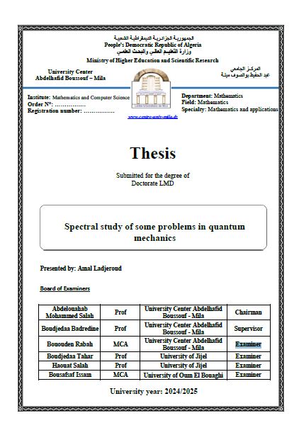 Ladjeroud Amal & Abdelouahab Mohammed Salah(Chairman), B. (2025). Spectral study of some problems in quantum mechanics (Doctorat-LMD) . Centre universitaire Abdelhafid Boussouf Mila.