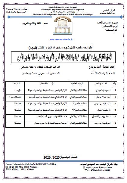 جربوع أمال & مرباح وسيلة(رئيسا)،بومالي حنان(مشرفا ومقررا)،بن دريس سامية(ممتحنا)،خليل سليمة(ممتحنا)،بوالقندول فوزية(ممتحنا)،بورويس كريمة(ممتحنا) (2025). الأنساق الثقافية في روايات ليالي إيزيس كوبيا ،و2084 حكاية العربي الأخير وشرفات بحر الشمال لواسيني الأعرج (دكتوراه) . المركز الجامعي عبد الحفيظ بوالصوف ميلة.