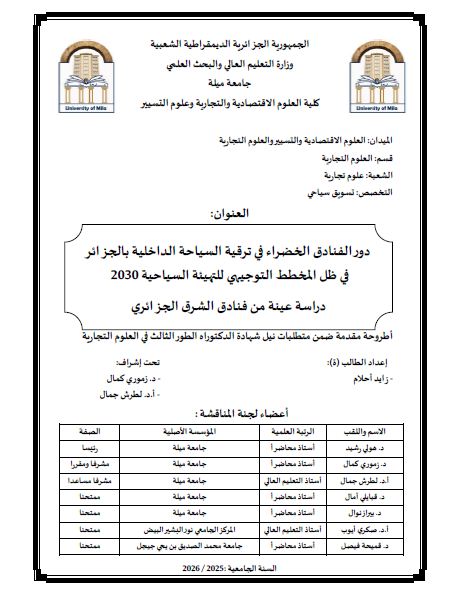 زايد أحلام & هولي رشيد(رئيسا)،زموري كمال(مشرفا ومقررا)،لطرش جمال (مشرفا مساعد)،قبايلي أمال(ممتحنا)،بيراز نوال(ممتحنا)،صكري أيوب(ممتحنا)،قميحة فيصل(ممتحنا) (2026). دورالفنادق الخضراء في ترقية السياحة الداخلية بالجزائر في ظل المخطط التوجيهي للتهيئة السياحية 2030 دراسة عينة من فنادق الشرق الجزائري (الدكتوراه.) . جامعة المجاهد عبد الحفيظ بوالصوف ميلة.