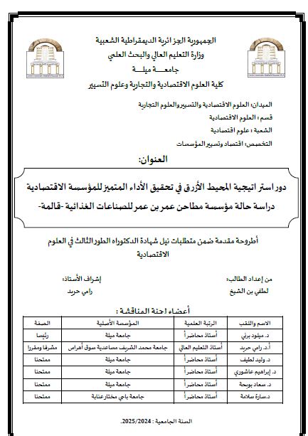 بن الشيخ لطفي & برني ميلود(رئيسا)،حريد رامي(مشرفا ومقررا)،لطيف وليف(ممتحنا)،عاشوري ابراهيم(ممتحنا)،بوبحة سعاد(ممتحنا)،سلامة سارة(ممتحنا) (2025). دور استراتيجية المحيط الأزرق في تحقيق الأداء المتميز للمؤسسة الاقتصادية دراسة حالة مؤسسة مطاحن عمر بن عمر للصناعات الغذائية -قالمة- (دكتوراه) . جامعة المجاهد عبد الحفيظ بوالصوف ميلة.